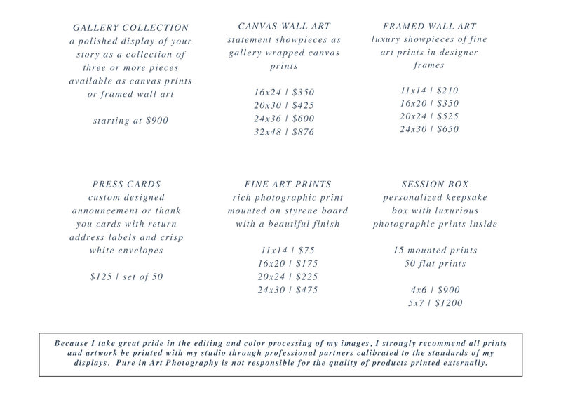Because I want to ensure your album design and wall art are exactly the way you want it, I set aside this time to finalize your product order one-on-one. Please take the time to review my product catalog in detail prior to our order session and discuss budgets or expectations together so when you are presented with the images, I can help guide you through products and price points you're comfortable with and ensure you walk away with beautiful items you will be proud to show off!